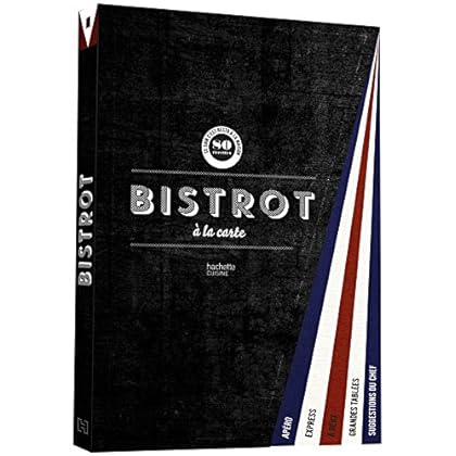 Ouvrez la carte de notre bistrot et laissez-vous tenter par nos spécialités ! Choisissez votre menu parmi plus de 80 recettes pour toutes les circonstances :Apéro : kir classique, tapenade d'olives noires, caviar d'aubergines, rillettes de lapin, etc.Express : ufs mimosa, soupe à l'oignon, magret de canard aux cerises, îles flottantes, poire Belle-Hélène, etc.À deux : escargots de bourgogne, endives au jambon, poulet basquaise, confit de canard, crêpes suzette, riz au lait, etc.Grandes tablées : soupe de butternut au confit de canard, petit salé aux lentilles, gratin dauphinois, ratatouille niçoise, charlotte au chocolat, crème brulée, etc.Faites votre choix !Et pour les plus indécis, découvrez les suggestions du chef : menu de fête, menu pique-nique, menu terroir, menu végétarien, etc.Le livre-menu idéal pour recevoir à la maison comme dans un véritable bistrot